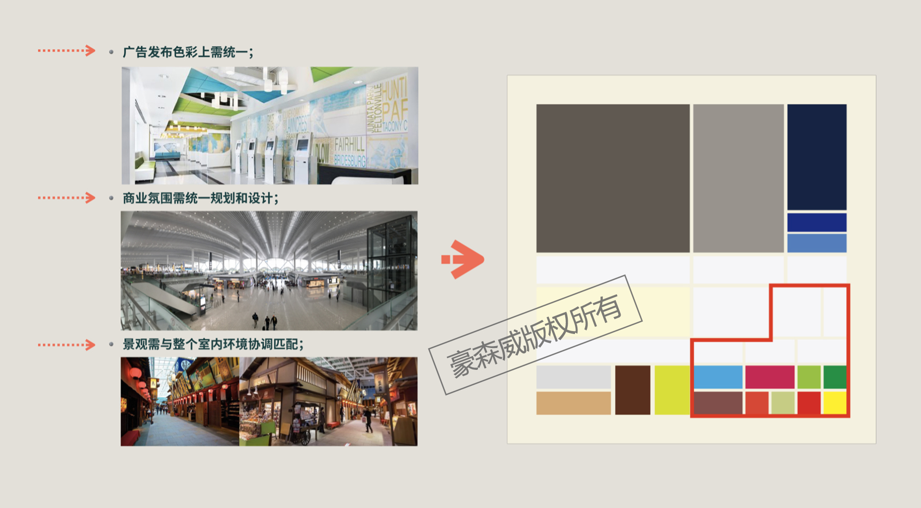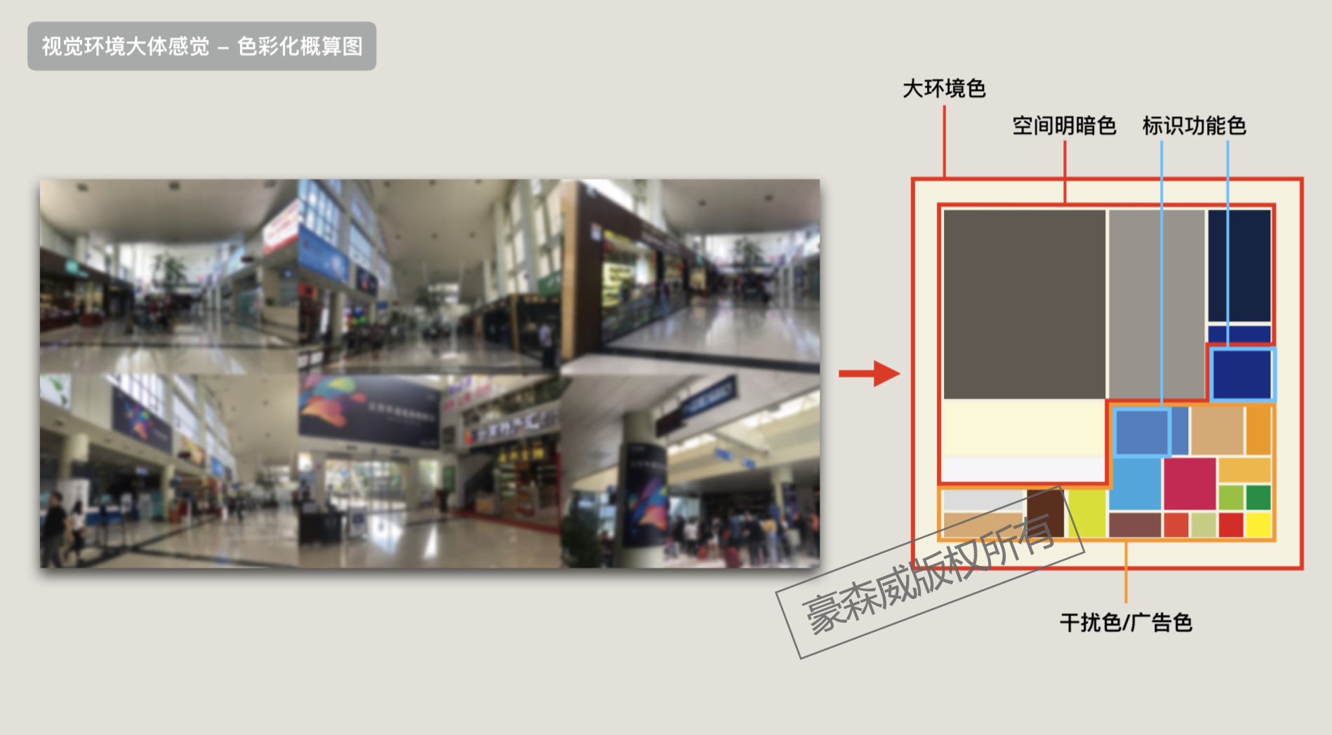 但是,候機樓內(nèi)部由于商業(yè)和廣告色彩過多導(dǎo)致→視覺干擾強烈、重要功能區(qū)域偏暗→不能快速找到目的地、非功能區(qū)色彩不協(xié)調(diào)→旅客焦慮感提升、導(dǎo)視功能標(biāo)識不明顯→運營管理成本提高。