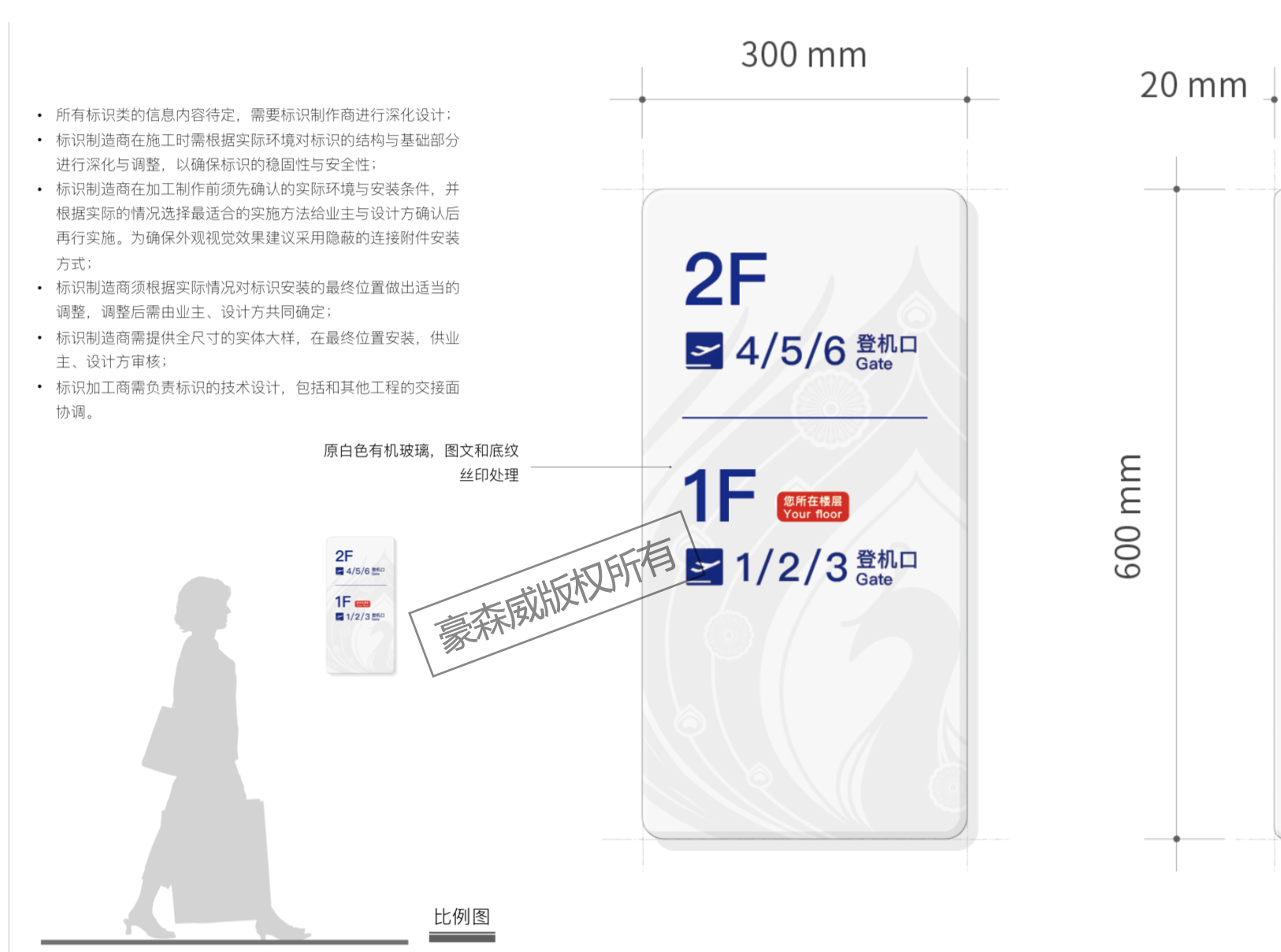 根據(jù)國標(biāo)/建筑特點/客流與工作流動線,設(shè)計團隊進行了信息分析和分類,按照國際機場中遠(yuǎn)距離識別可覆蓋的人群要求(注:15-20米內(nèi)抬頭清晰可閱讀),調(diào)整了標(biāo)識點位及尺寸可擴展、可理解信息量和空間距離感,主要以空中標(biāo)識為主體,少量地面立式標(biāo)識為補充,主要的考慮是地標(biāo)占地易形成障礙點對客流的自然流動有一定的影響。