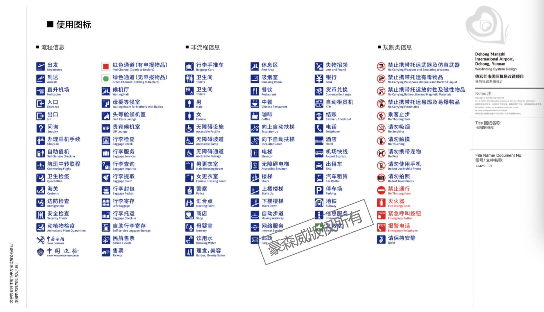 作為一個國際樞紐級支線機場,此次“導(dǎo)向標(biāo)識系統(tǒng)”整體改造,須完全采用國際通用標(biāo)識規(guī)范,以利于外國友人能夠很好進行圖文信息閱讀,為長遠(yuǎn)開拓國際航線墊定基礎(chǔ),如下圖所示: