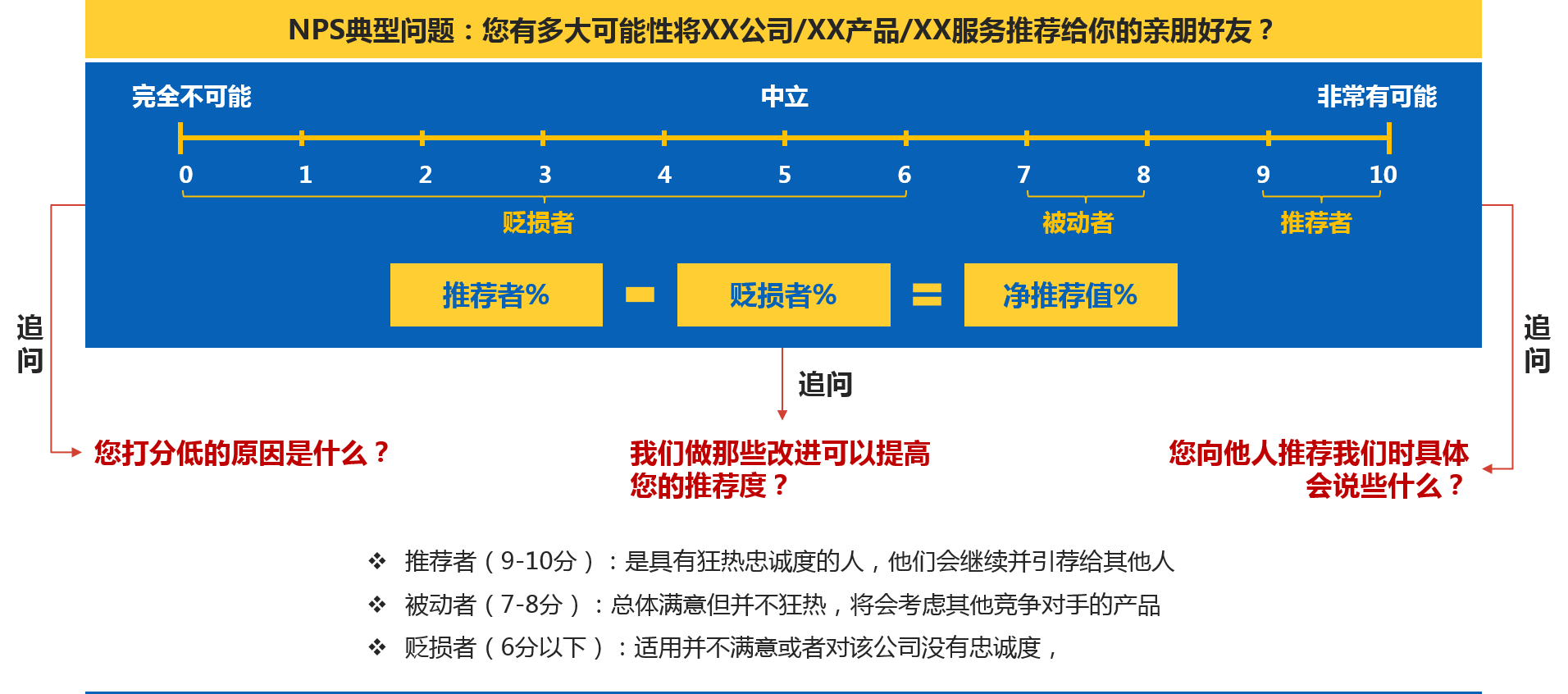 NPS(凈推薦值)作為一種簡單的客戶忠誠度量化方法,不僅能夠有效反映客戶口碑,還與財務指標高度相關,能幫助剔除企業(yè)不良利潤,并激勵員工士氣,因此日漸受到國內外企業(yè)的追捧,成為了當前國際通用的衡量客戶忠誠的核心指標。NPS通過讓客戶對“您有多大可能將XX公司/產品/服務推薦給您的朋友?” 用0-10分評價,來計量某個客戶將會向其他人推薦某個企業(yè)或服務可能性的指數。