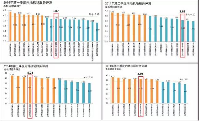 根據(jù)民航資源網(wǎng)的2014年機場服務評測得分狀況,由該得分可看出,南京機場下半年的服務表現(xiàn)比上半年的要好。在第一、二季度里,南京機場得分未能達到平均分,但在第3季度,得分就躍居第四,服務表現(xiàn)可謂突飛猛進。在第四季度,其得分排名也能保持在平均分以上,與第三季度相比,也有稍微的進步。