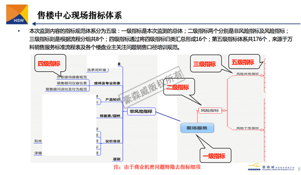 整個滿意度常態(tài)化監(jiān)察體系基于深挖客戶需求和心理感知,解構(gòu)客戶觸點,構(gòu)建銷售邏輯與完善銷售流程:從客戶第一次進入銷售案場,客戶的觸點由環(huán)境、物管服務,案場服務,情景體驗,后續(xù)服務五個環(huán)節(jié)組成。下為案場合服務涉及到2個二級指標、8個三級指標、16個四級指標及176個五級指標;