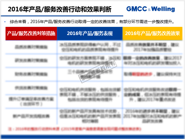 2016年12月,豪森威市場研究公司與美芝(GMCC)公司展開一年一度的顧客滿意度研究,在進(jìn)一步完善指標(biāo)體系的前提下,100%地覆蓋了所有客戶(包括美國、俄羅斯、巴西、印度、泰國等海外客戶),更是深感美芝(GMCC)公司對“顧客是生產(chǎn)線上最重要的部分”的核心管理思想實(shí)現(xiàn)了自上而下的高效運(yùn)行!