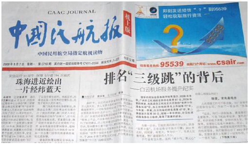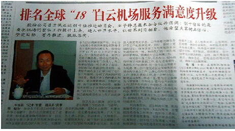 2.《白云機場股份報179期》、《廣州地鐵報2010年12月》,頭版刊載:“排名全球18,白云機場服務(wù)滿意升級”。2009年第一季度,白云國際機場的排名是第47位,第二季度躍升至第30位;第三季度更是前進到全球第18位,令全體員工勢氣振奮,堅定了更上一層樓的決心。